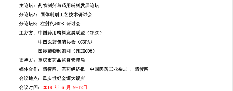 國(guó)家不斷深化藥品審評(píng)審批改革,推進(jìn)藥品全生命周期管理,全面落實(shí)藥品質(zhì) 量安全責(zé)任,針對(duì)性地進(jìn)行生產(chǎn)工藝核查,我國(guó)醫(yī)藥產(chǎn)業(yè)面臨供給側(cè)結(jié)構(gòu)改革的任 務(wù)。藥品審評(píng)審批制度改革方向是簡(jiǎn)化審評(píng)審批程序,鼓勵(lì)創(chuàng)新,突出藥品上市許 可持有人(MAH) 主體地位。通過(guò)簡(jiǎn)化審評(píng)、鼓勵(lì)創(chuàng)新、MAH 制度和藥品全生命周期 管理等監(jiān)管思路和理念統(tǒng)籌思考藥用輔料藥包材與藥品關(guān)聯(lián)審評(píng)審批制度。選擇和 使用藥用輔料、藥包材應(yīng)由藥品上市許可持有人(制劑企業(yè))基于制劑特點(diǎn)來(lái)判斷, 進(jìn)而系統(tǒng)評(píng)價(jià)藥品的安全有效穩(wěn)定。總局將加快藥包材藥用輔料登記平臺(tái)建設(shè),進(jìn) -步完善和細(xì)化相關(guān)政策。為更好的推進(jìn)藥品全生命周期的管理,促進(jìn)中國(guó)藥物制 劑的快速發(fā)展,《第六屆PhExFEST 中國(guó)藥物制劑節(jié)&暨2018中 國(guó)制藥科學(xué)家大會(huì)》 將于6月上旬在重慶舉行。屆時(shí)將邀請(qǐng)總局有關(guān)部門、中檢院、藥典委員會(huì)、科研院 校、制劑研發(fā)CRO、藥輔和設(shè)備儀器企業(yè)的專家作主題報(bào)告。熱誠(chéng)歡迎藥物制劑生產(chǎn)、制劑研發(fā)、制藥設(shè)備、分析儀器、藥用輔料及包材等企業(yè)代表和科研高校師生參 加本屆大會(huì)。